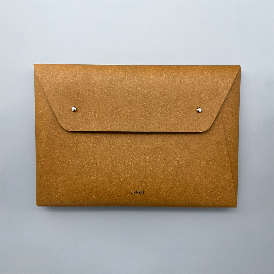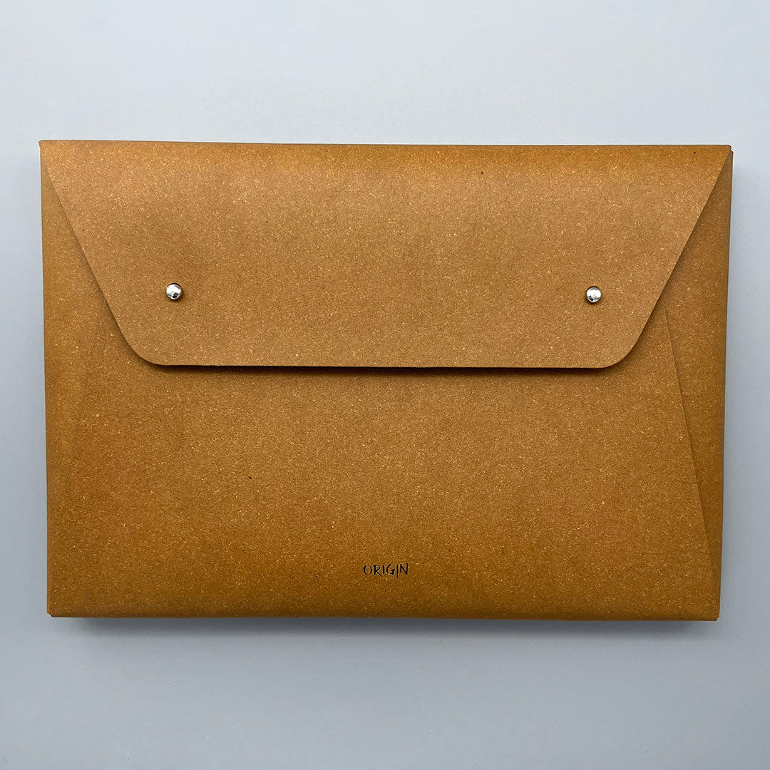 Envelope style sleeve bag in recycled leather, made from leather scraps destined for disposal and some natural latex. A water-based varnish is applied to the outside to make the product more stain and water resistant. Note that the inside of the sleeve is unlined.