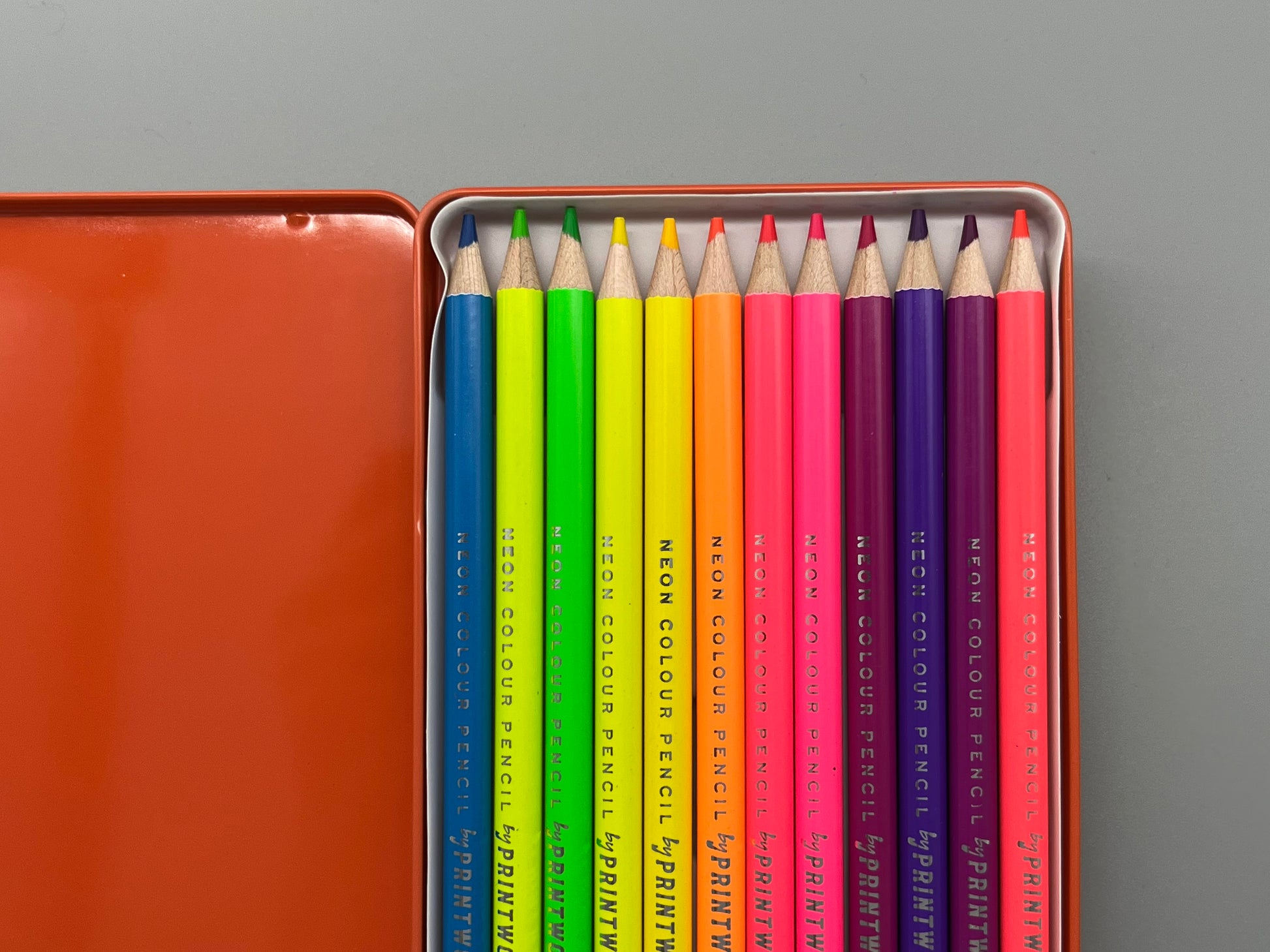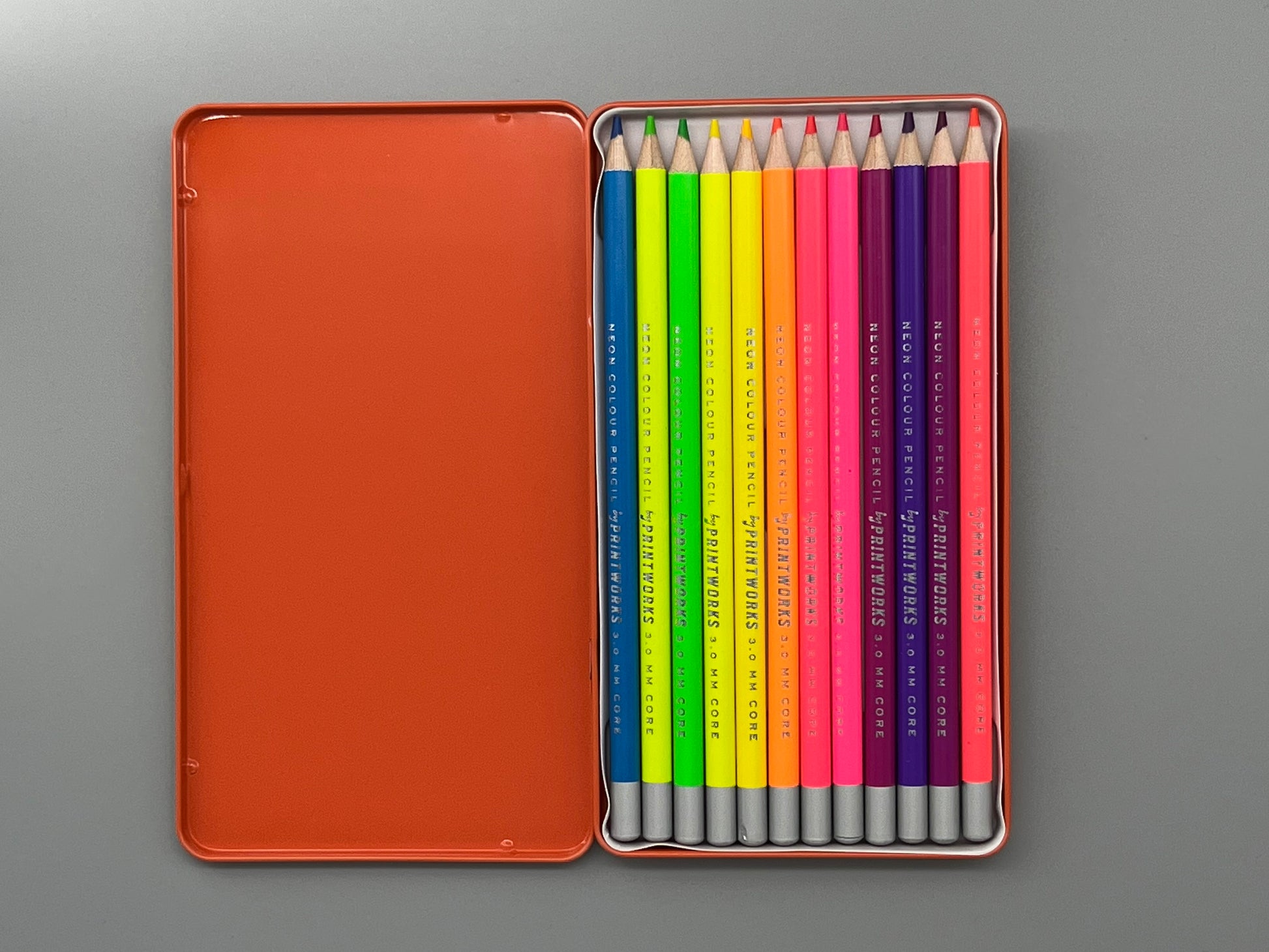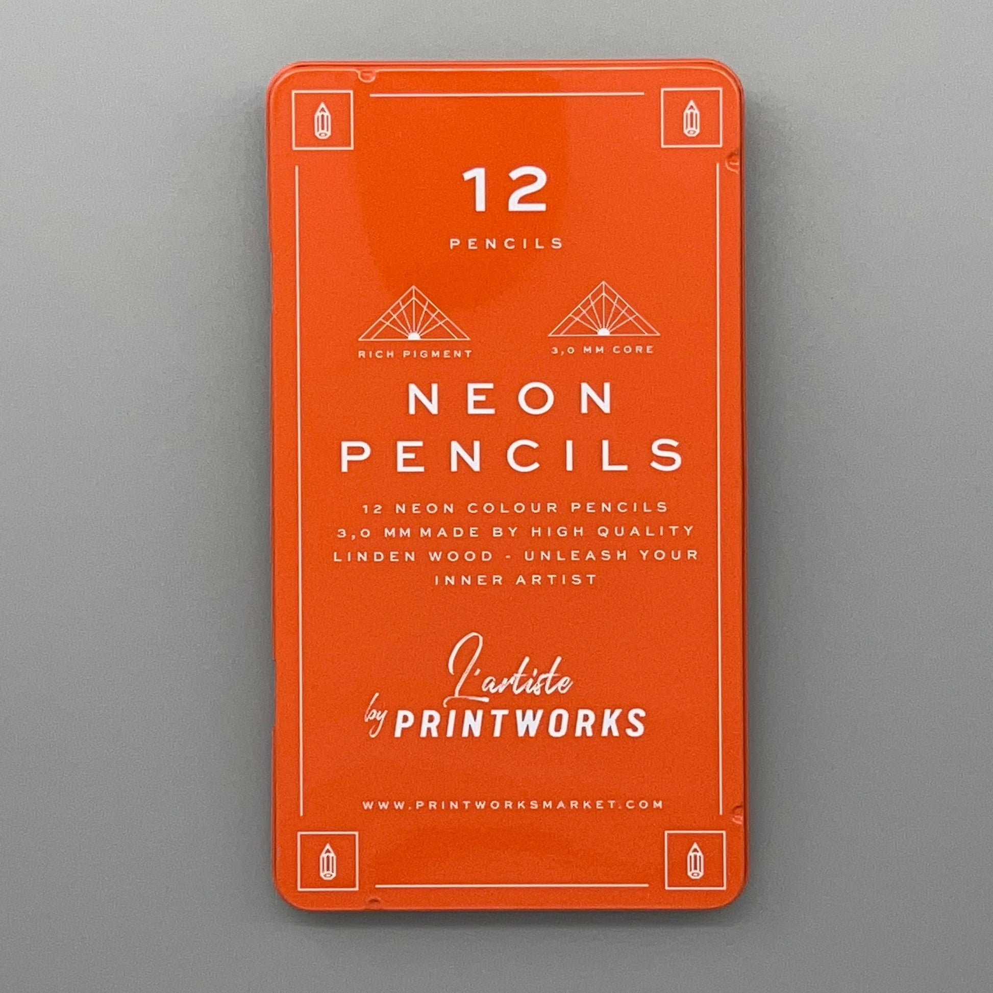 Super soft and long lasting colour pencils L'artiste by Printworks. Beautiful tin box containing 12 pencils in different neon colours. Extra thick 4 mm core. Easy to sharpen without breaking. Made by linden wood. Designed in Sweden.