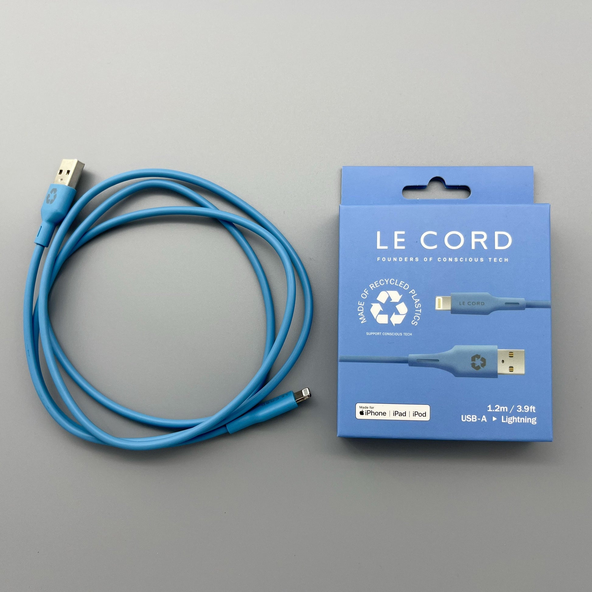 iPhone cable made from recycled plastic by Swedish brand Le Cord. Made for iPhone/iPad/iPod. USB-A to Lightning.