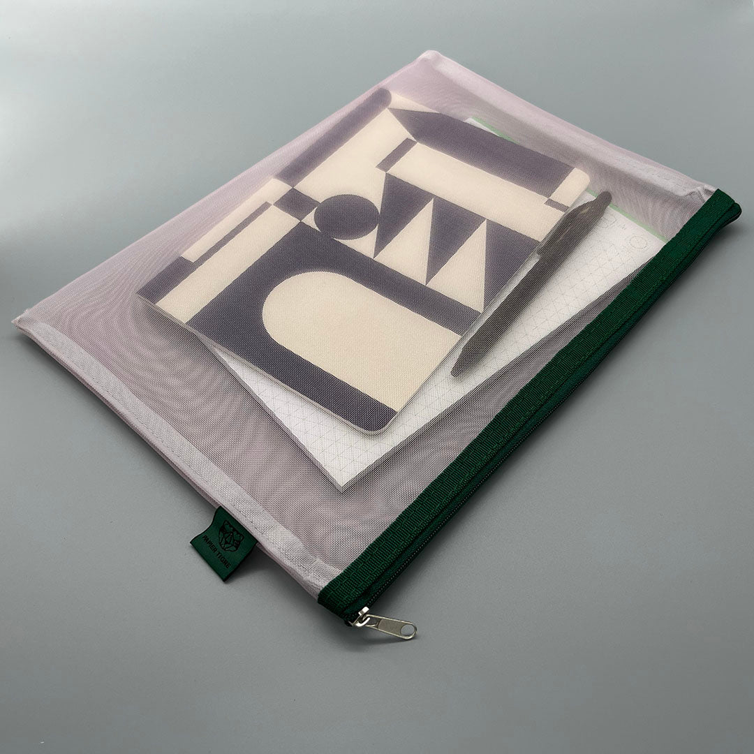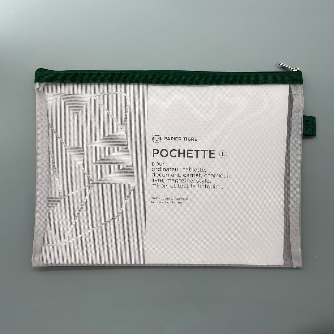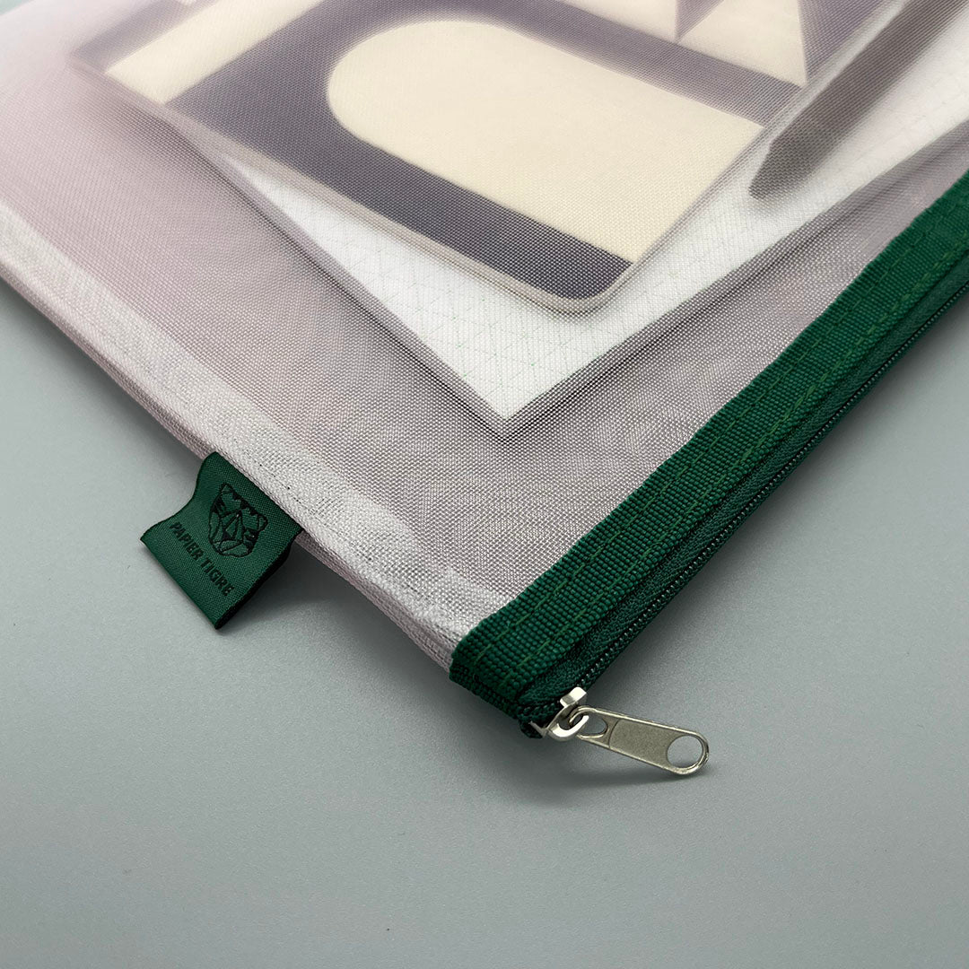 Transparent mesh pocket with zip closure. Perfect for keeping notebooks, pens and pencils or other loose items such as keys, toothbrushes, jewellery, make up, travel documents.