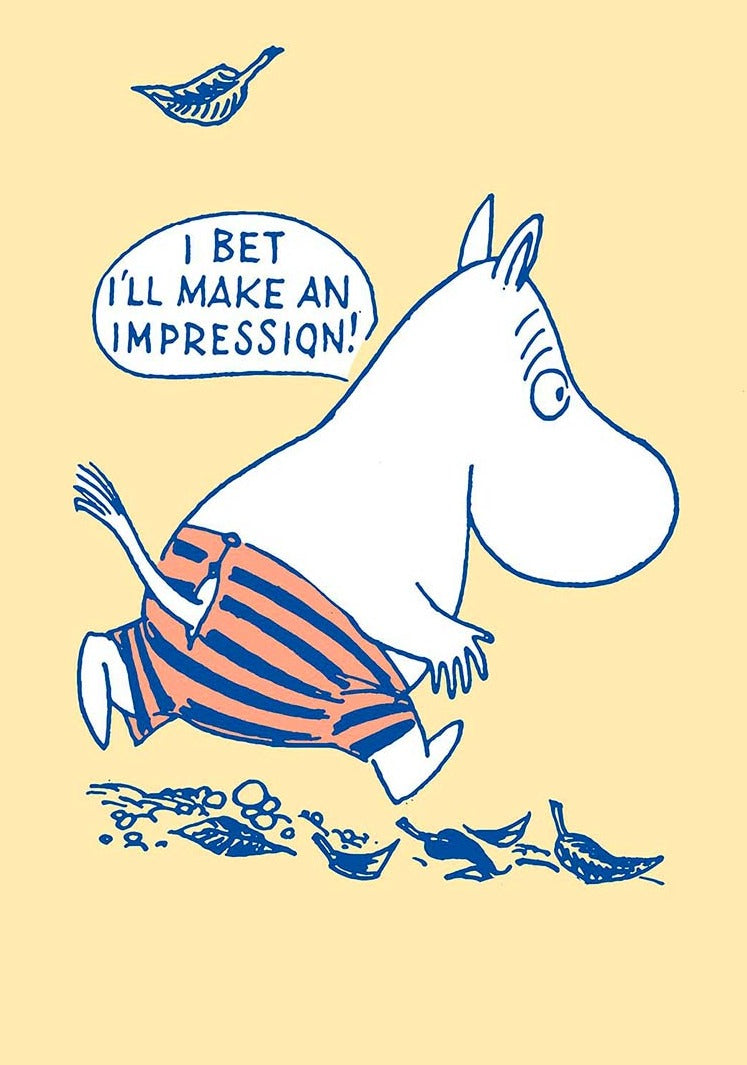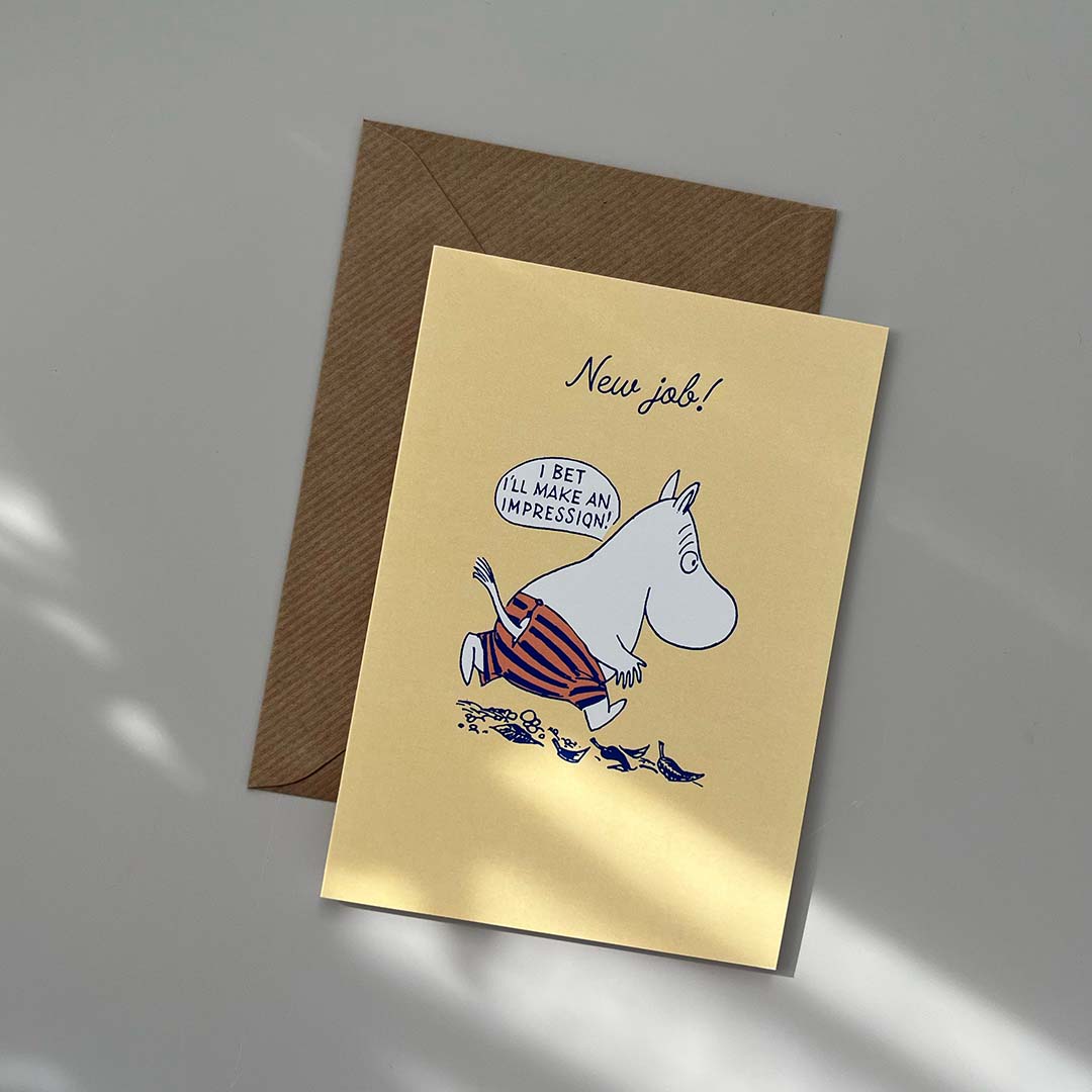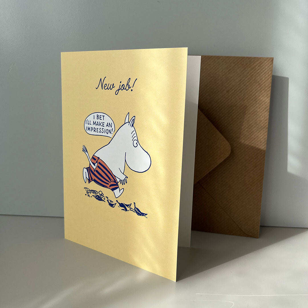 Congratulate on the new job with this cheerful and friendly Moomin card. Folded greeting card. Blank inside. Comes with a brown envelope.
