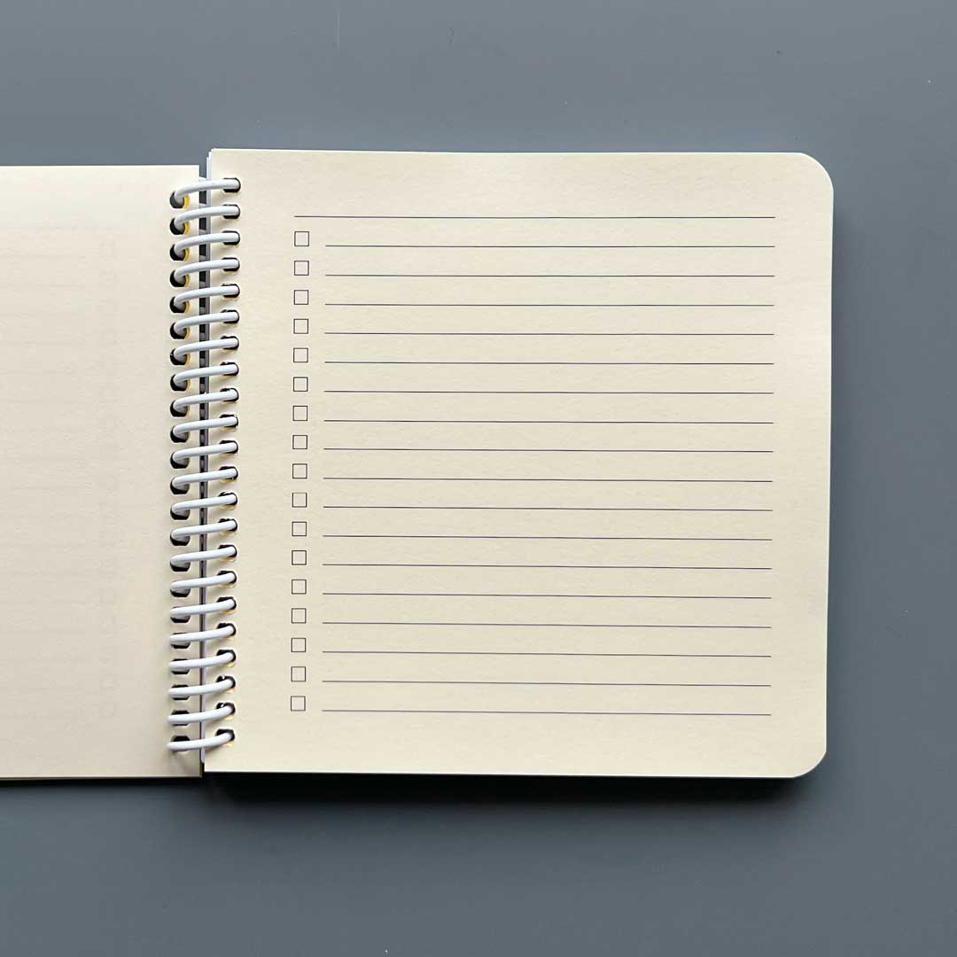 Measurements: 158 x 148 x 12 mm 10 checklist pages (120g pale yellow paper stock) 120 blank pages (80g white paper stock) Spiral binding |