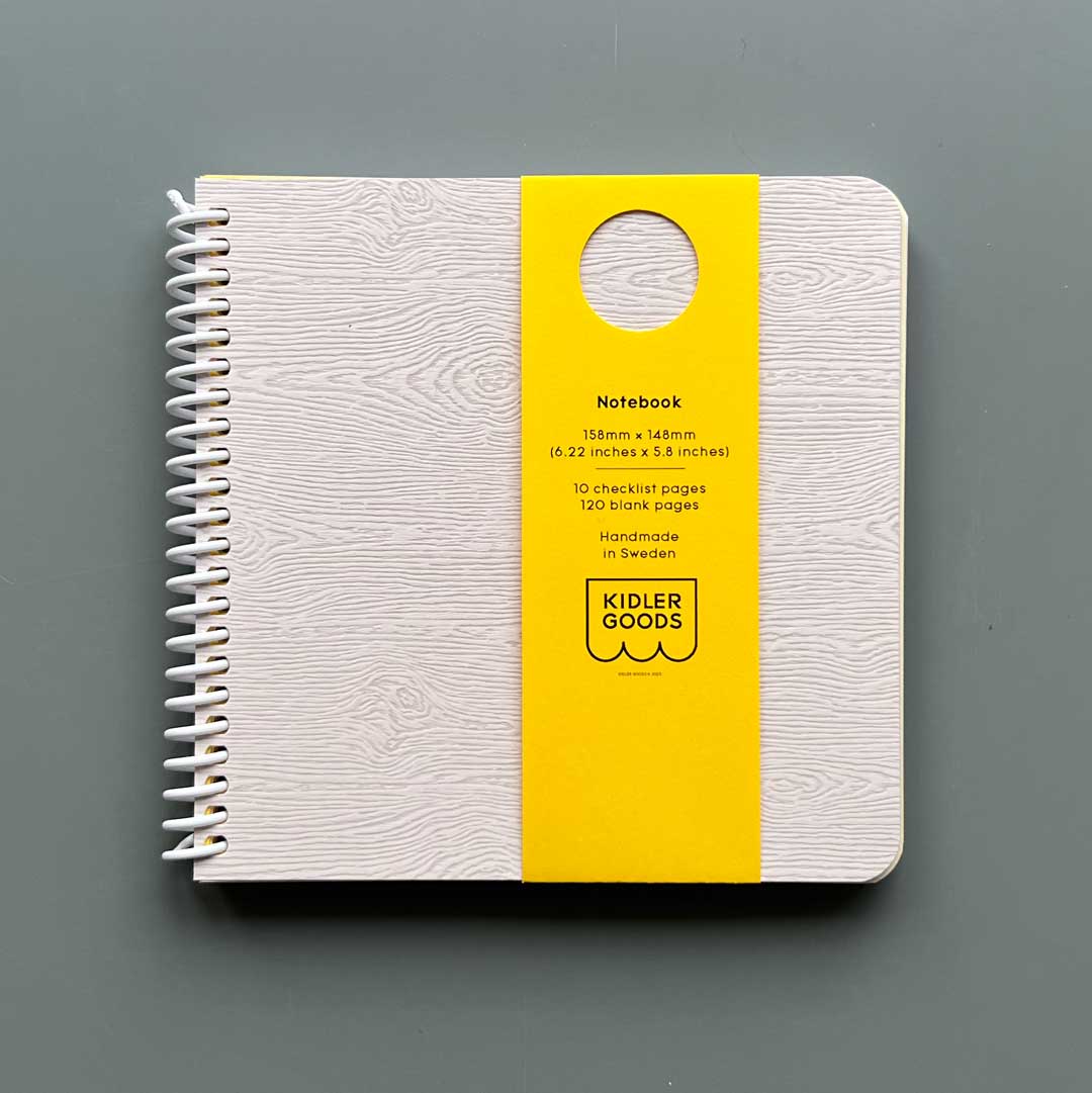Kidler Goods notebooks are handmade in our workshop. Unique cover in embossed wood grain paper that looks and feels like actual wood. Contains 10 practical checklist pages and 120 blank pages where your pens can roam freely. Flexibel spiral binding allows the pages to be opened a full 360 degrees (cover to cover) and still lay flat. Great if you're left-handed like us! We think they are the perfect size.