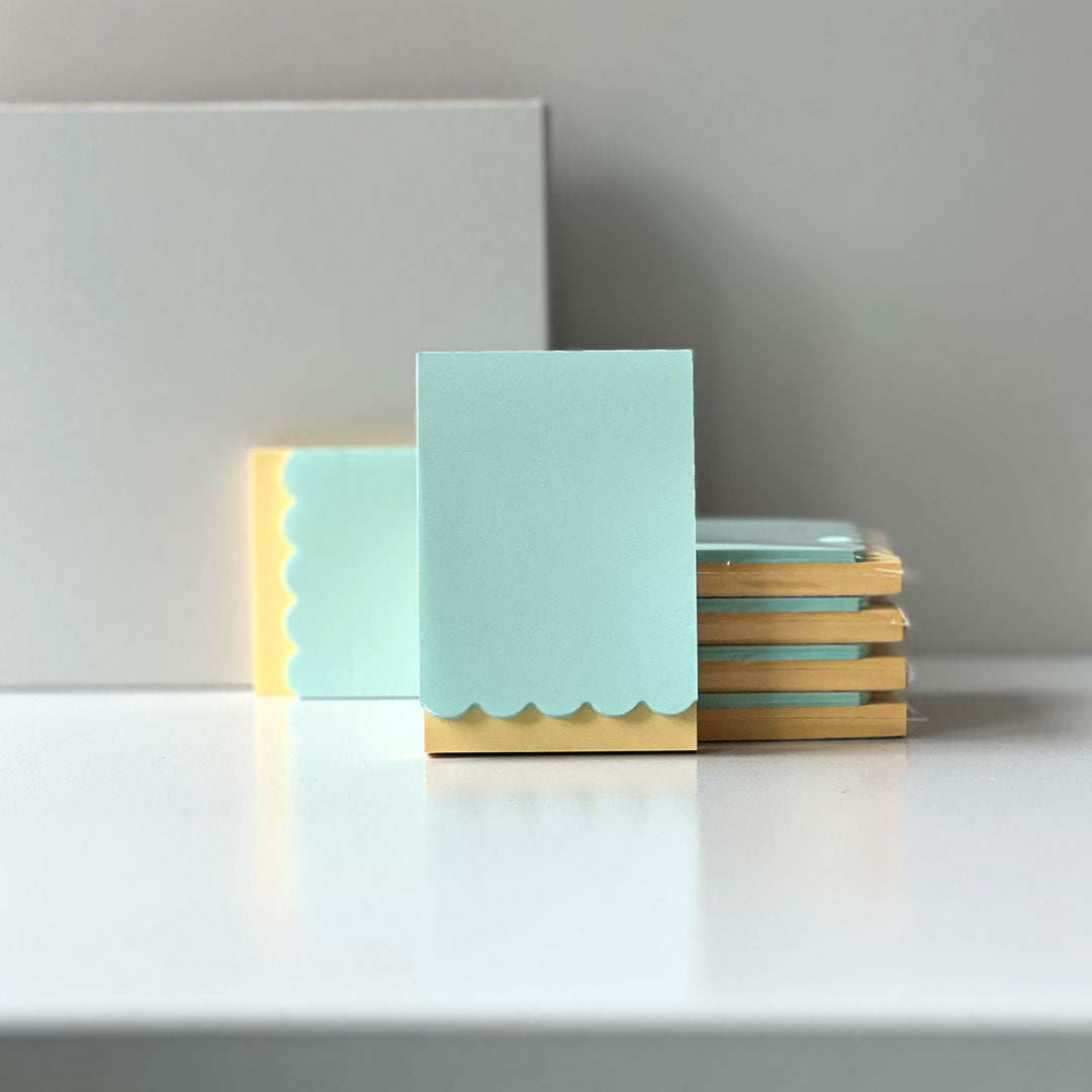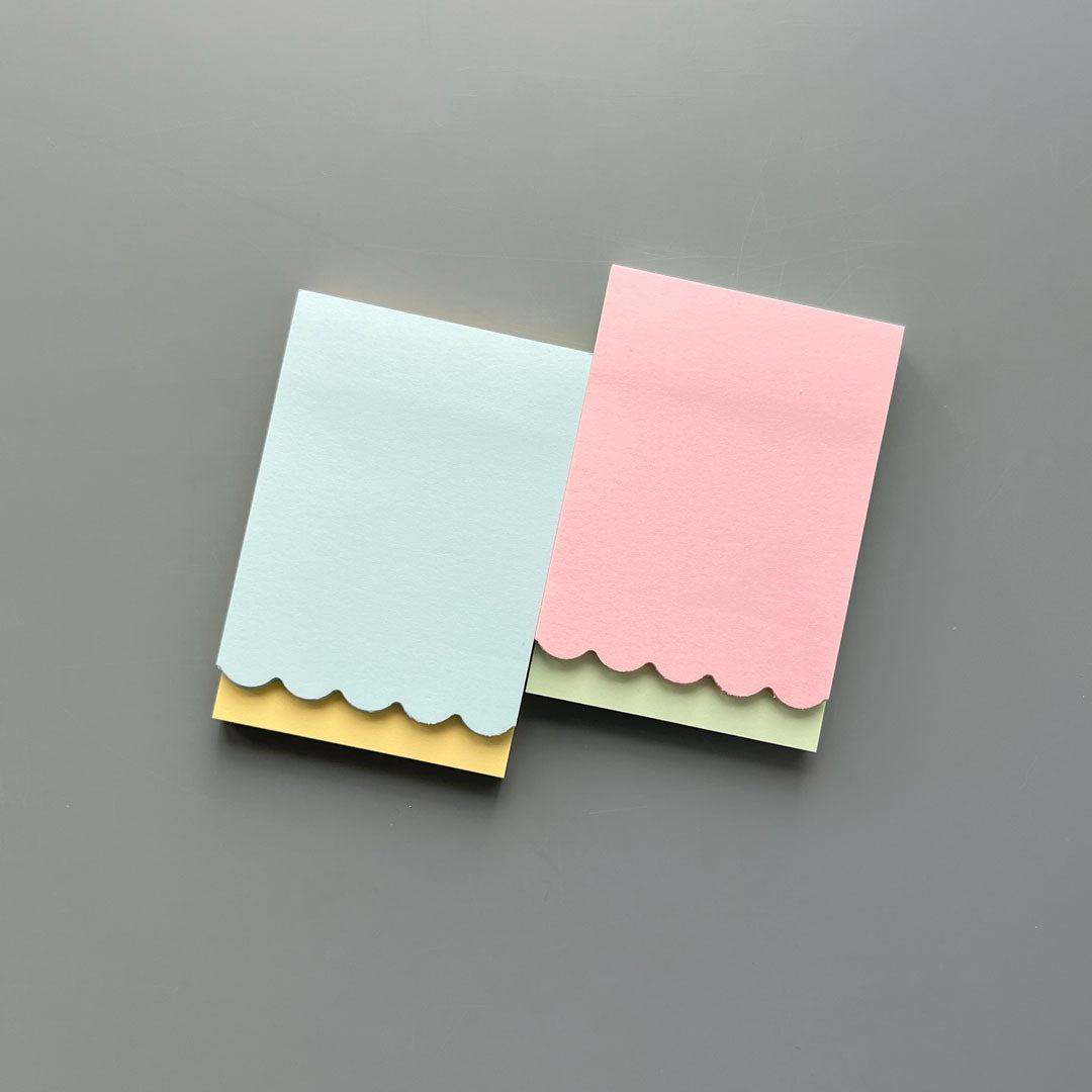 Sticky notes in two soft pastel colours. One rectangular and one with a scalloped edge. Each little pad contains approx. 100 adhesive sheets. Can be repositioned or removed without leaving marks.