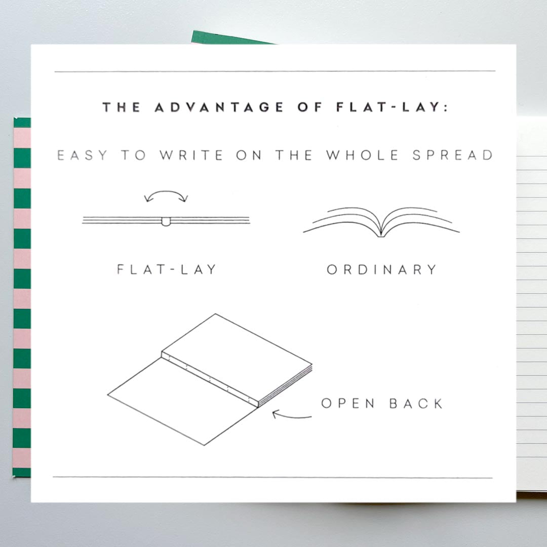 Stylish notebook with plenty of ruled sheets for creative souls. The notebook is sewn along the back so when opened, it presents a perfectly flat surface, with a seamless transition between left and right.
