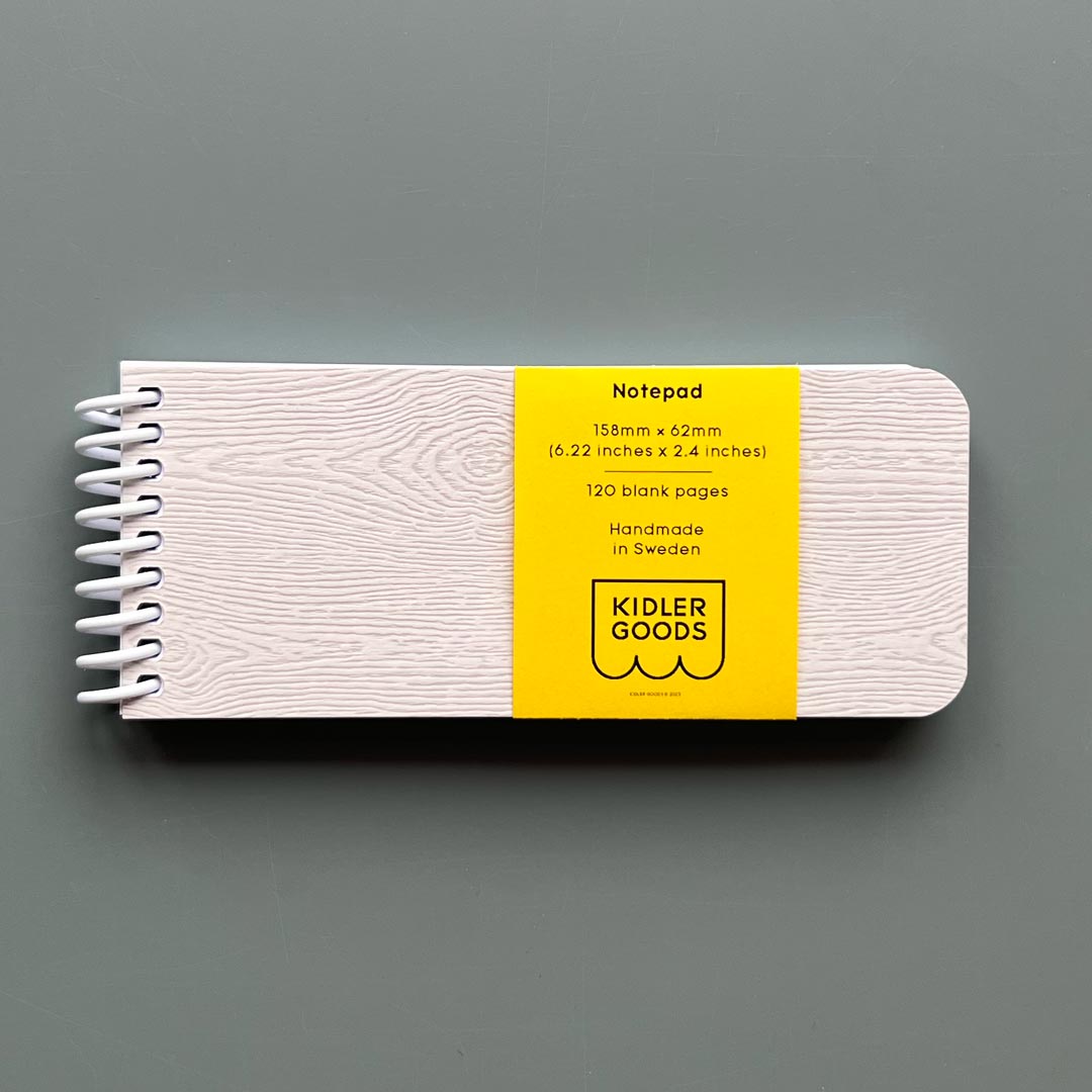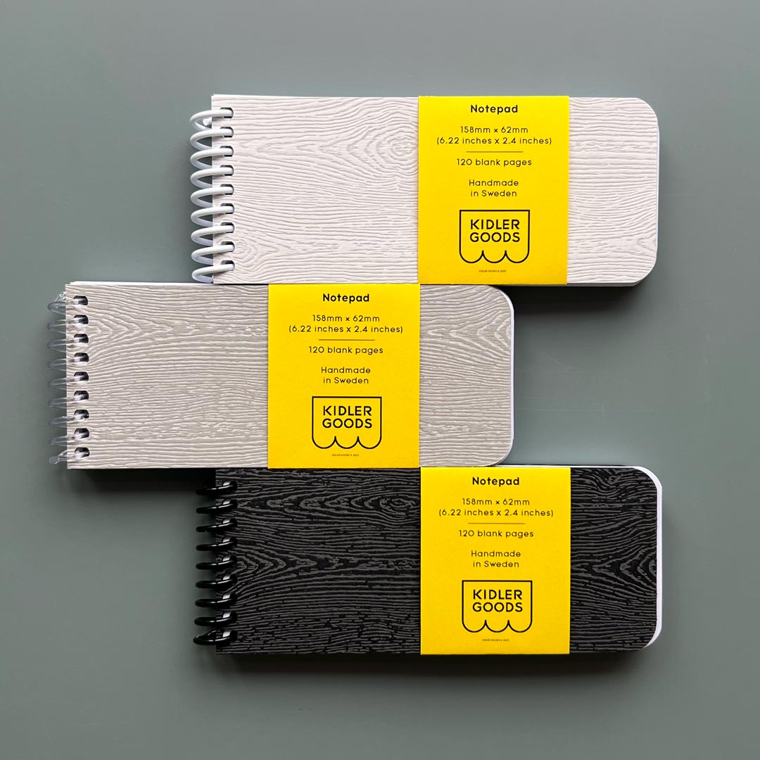 Kidler Goods notepads are handmade in our workshop. Unique cover in embossed wood grain paper that looks and feels like actual wood. The pad contains 120 blank pages and is the perfect size for jotting down things on the go. Flexibel spiral binding allows the pages to be opened a full 360 degrees (cover to cover) and still lay flat.