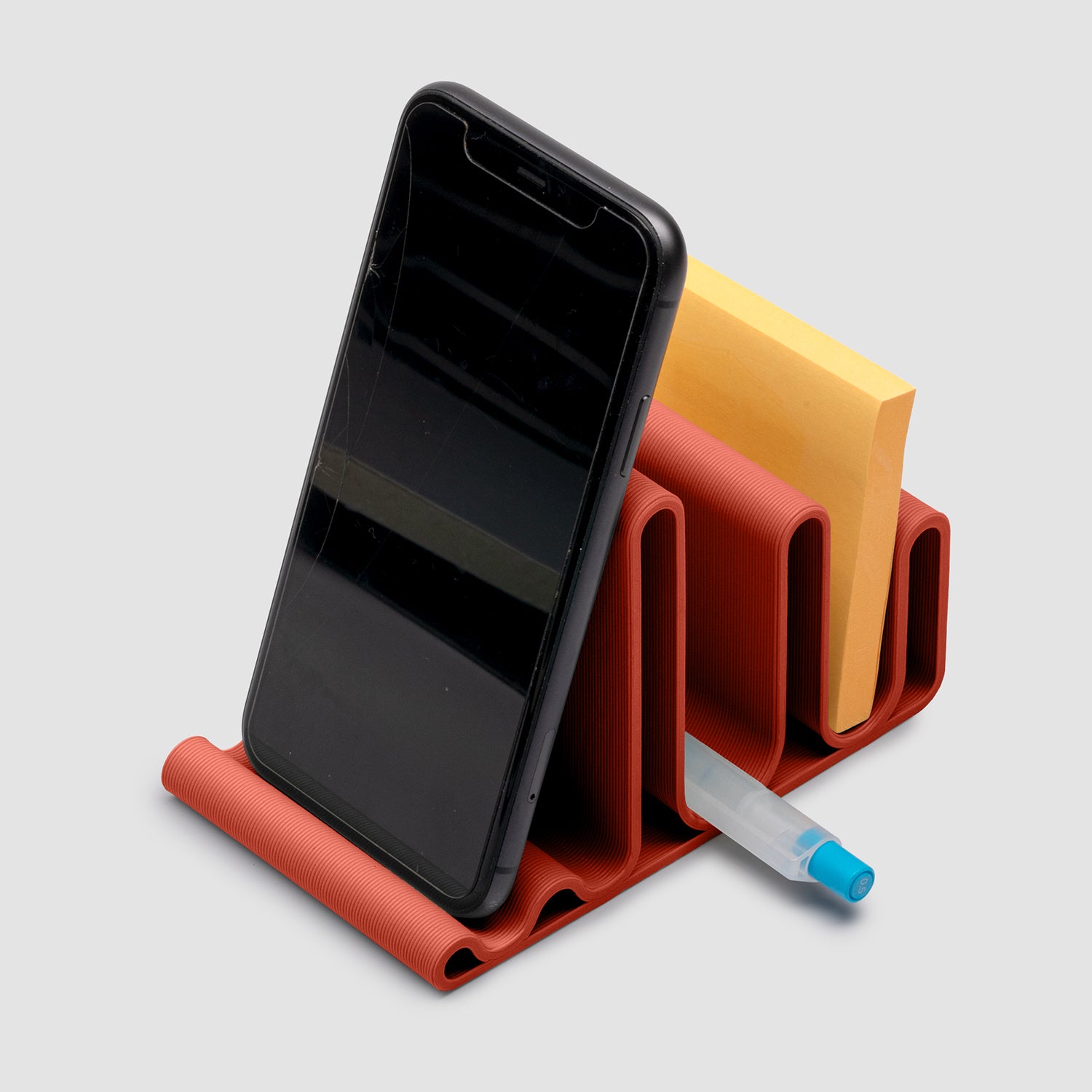 Kan det finnas något bättre sätt att hålla mobilen och annat viktigt inom räckhåll än på detta vågiga ställ? Den här lekfulla förvaringsserien är 3D-printad av återvunnet förpackningsmaterial av växtbaserad plast. Kombinera stället med andra enheter från bFRIENDS kollektion för att hålla snyggt och ordning på ditt skrivbord!