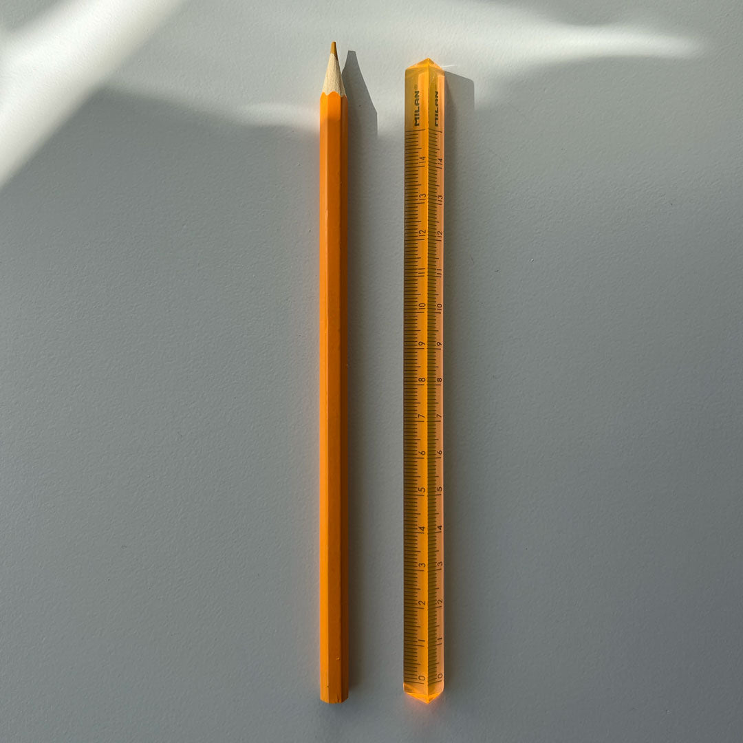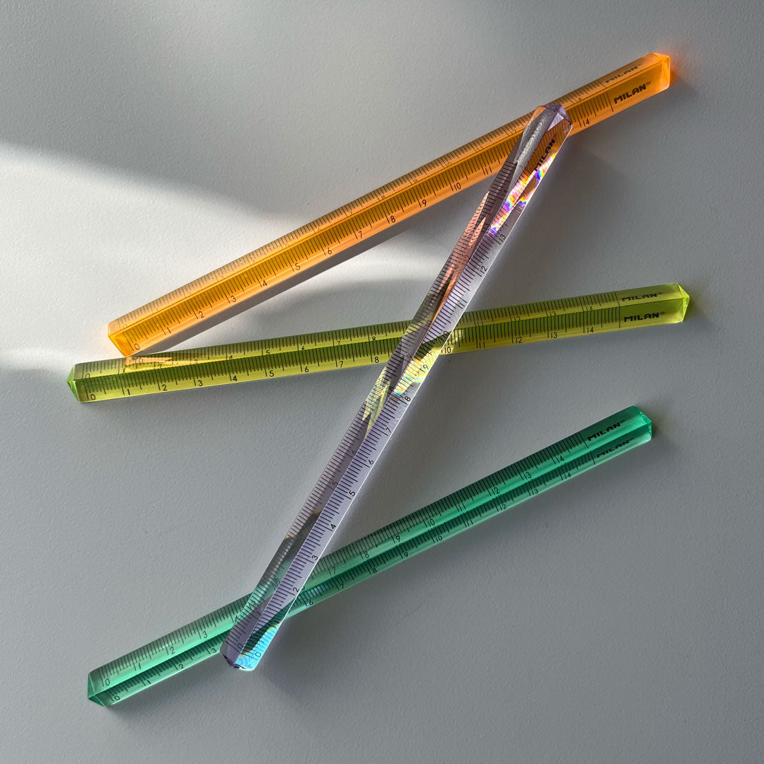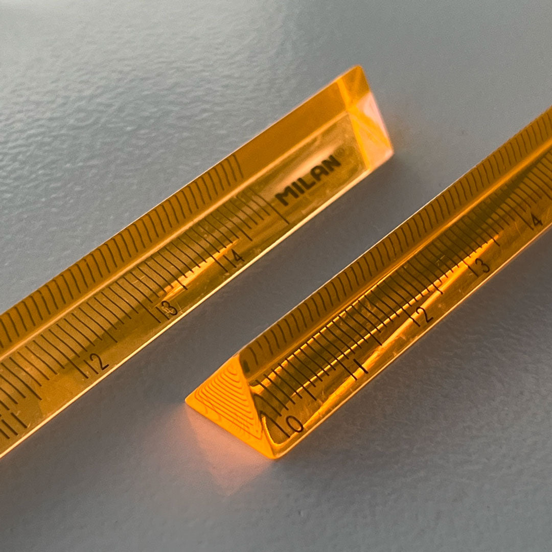 Färgglad trekantig linjal i genomskinlig plast med 15 cm mätmarkeringar. Finns i gult, orange, mintgrön eller lila. Den smala designen gör att den lätt får plats i de flesta pennfodral.